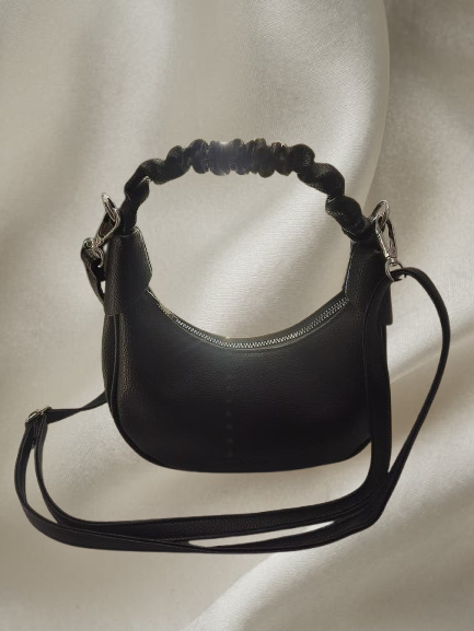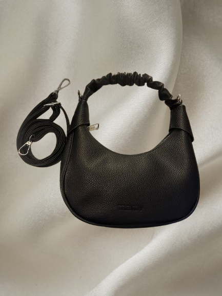 Cartera hobo ( tipo media luna) negra con asa fruncida texturada y bandolera regulable. Cierre metálico plateado y bolsillo exterior. Un diseño con carácter que eleva cualquier look — de jean y remera o con un blazer. Versátil, cómoda y con ese detalle en el asa que la hace diferente.