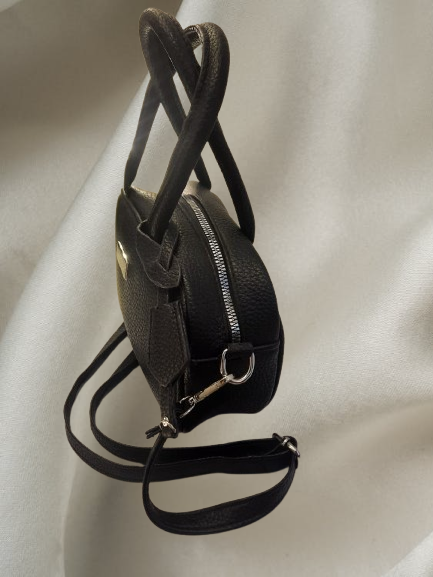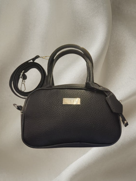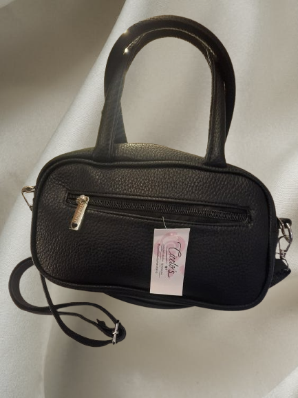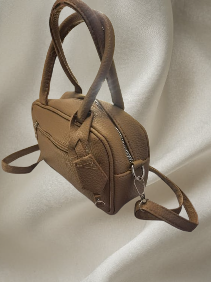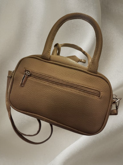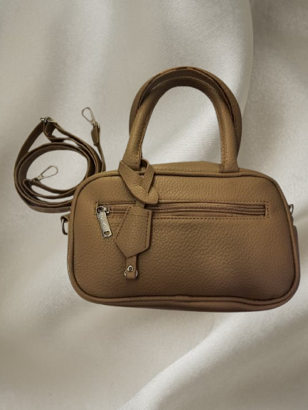 Mini cartera baulito en símil cuero grano topo. Doble asa corta y bandolera regulable para usarla como quieras. Bolsillo trasero con cierre. Compacta pero con espacio para lo esencial. El color topo combina con absolutamente todo — es de esas que no te vas a querer sacar.