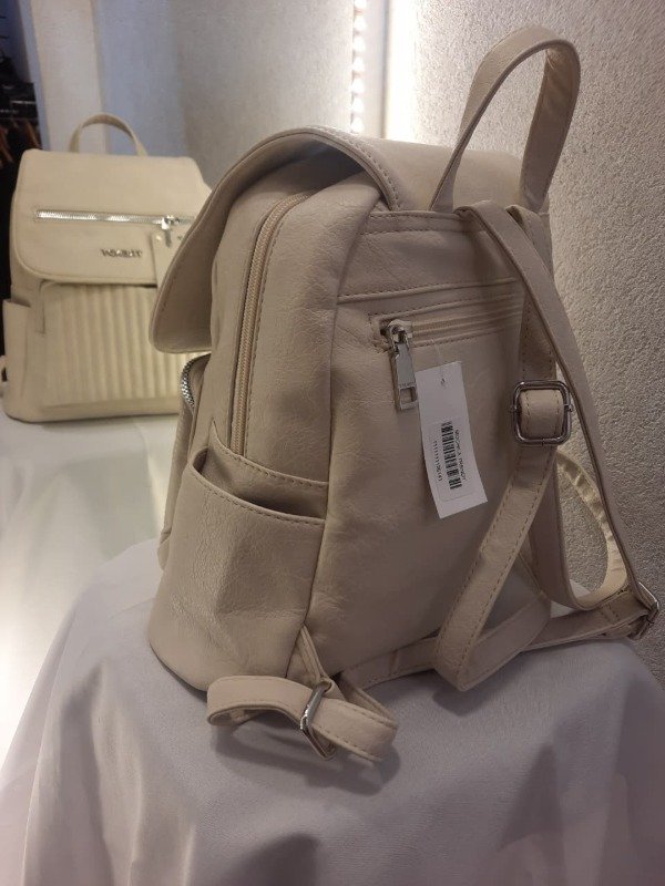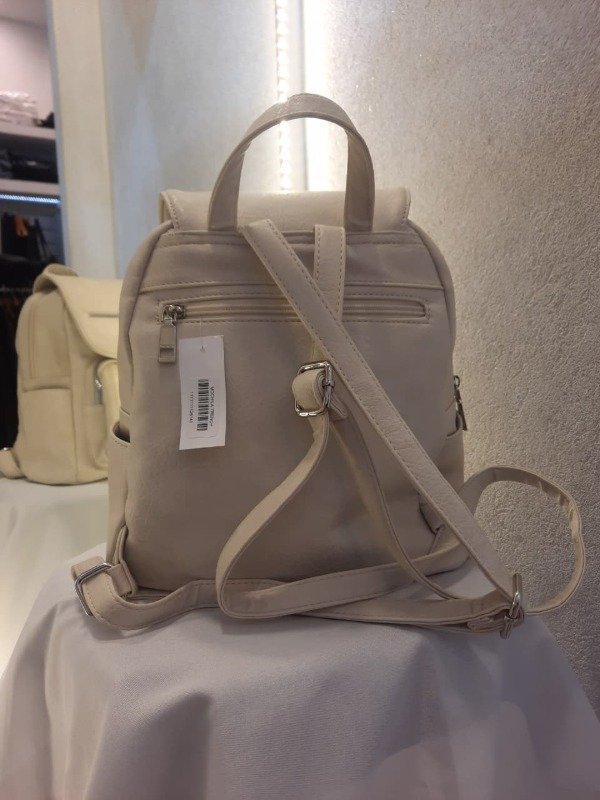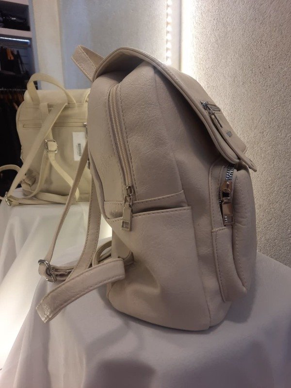 Off White Elegancia en su máxima expresión. Mochila en cuero símil tono beige/gris con solapa estructurada, bolsillo frontal acolchado con costuras verticales y logo TRENDY en plateado. Sofisticada y funcional, combina con todo. ✔ Diseño con solapa | ✔ Textura acolchada | ✔ Herrajes plateados
