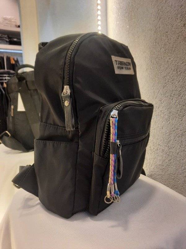 Funcional, liviana y con mucho estilo. Esta mochila en tela nylon negra es perfecta para la chica que está siempre en movimiento. Con múltiples compartimentos, bolsillos laterales y un dije de cordones multicolor que le da ese toque divertido y urbano. El parche "Trendy Stay True" la convierte en una pieza con identidad propia.