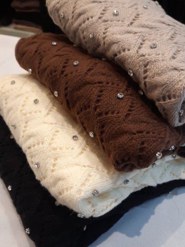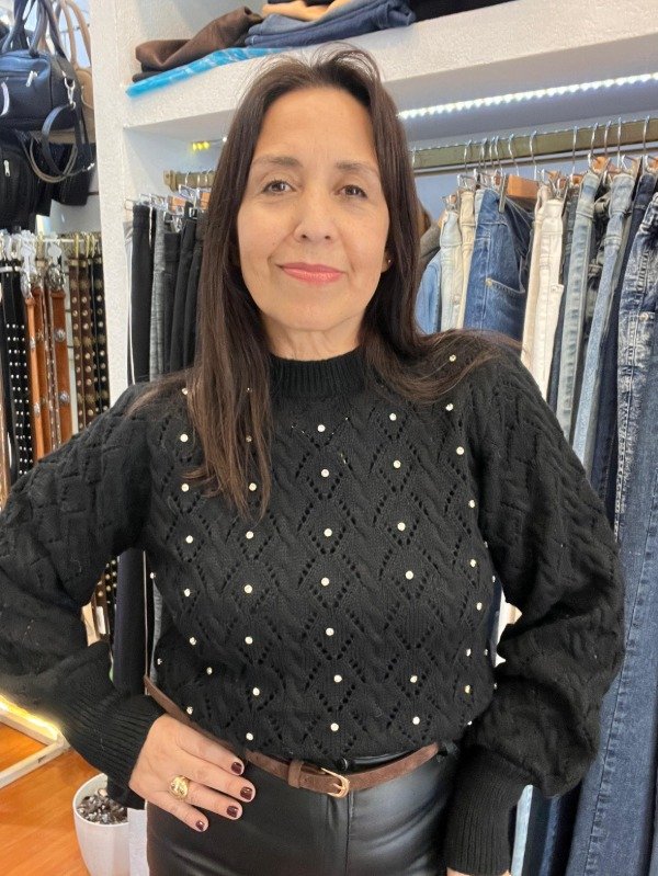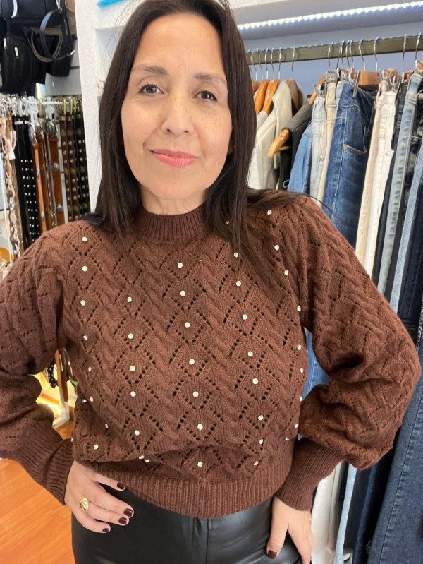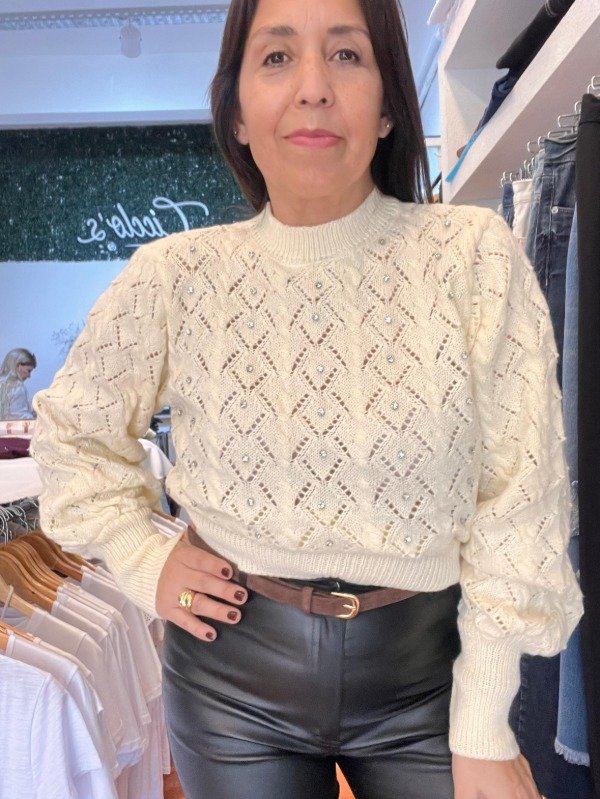 Sweater de hilo bremer grueso, caladito, con detalle de strass,cuello redondo,mangas globo puños