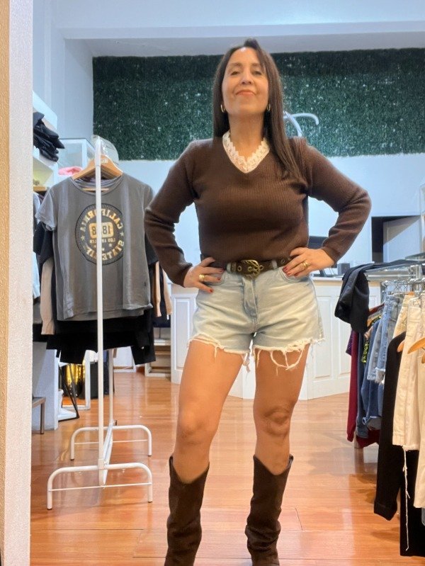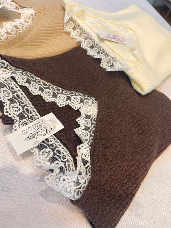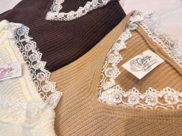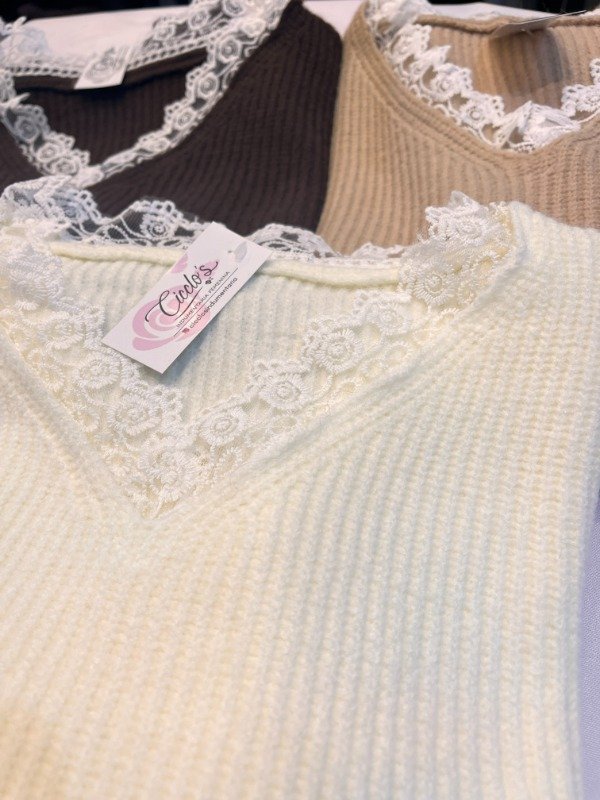 Sweater de hilo cashmere,detalle encaje cuello en V